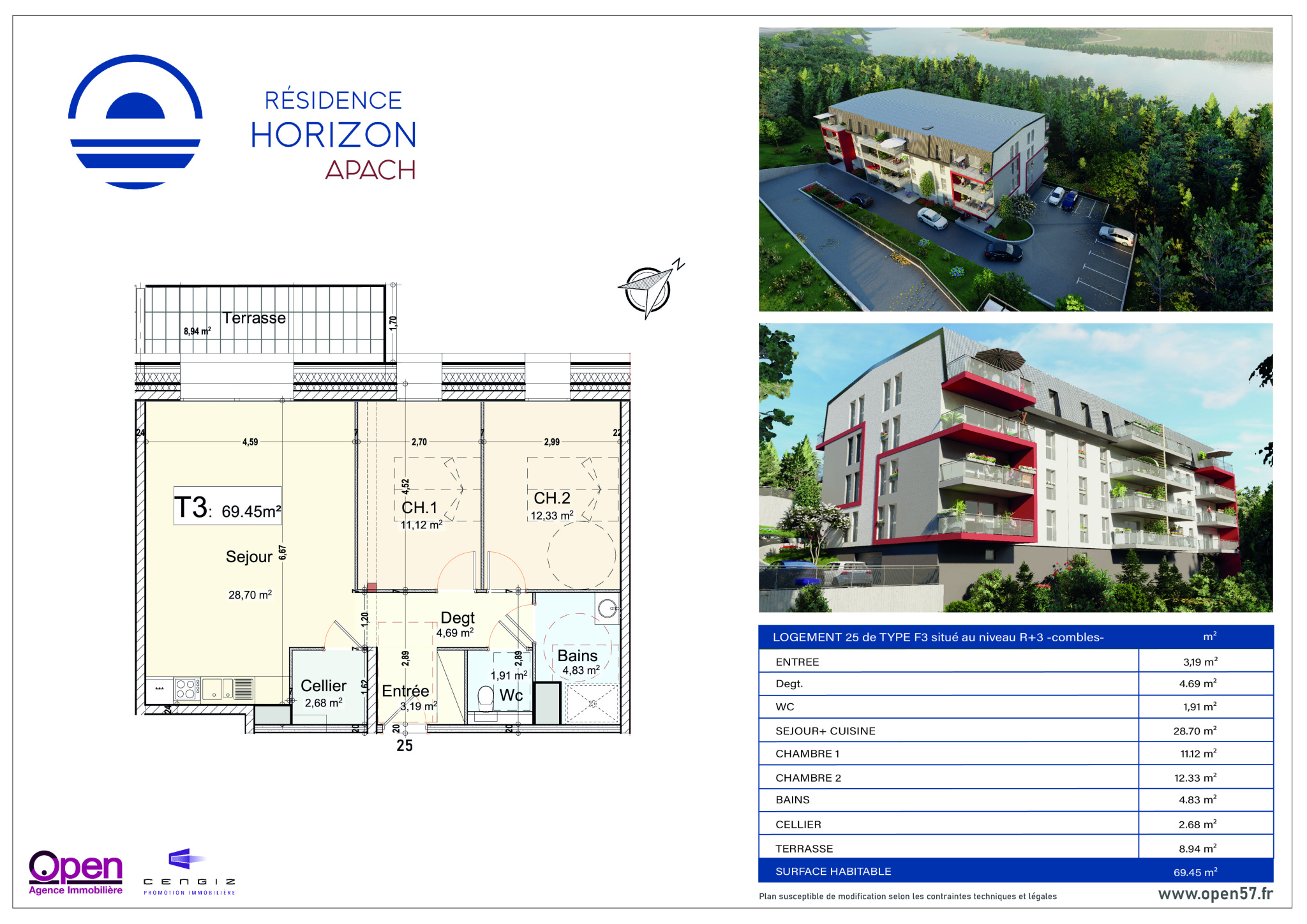 Découvrez ‘Horizon’, une résidence d’exception signée Cengiz Promotion, située au cœur de la prisée commune d’Apach, jouissant d’une proximité immédiate avec le Luxembourg tout en profitant du calme et de la verdure. Au sein de cette résidence de haut standing, nous vous proposons un appartement 4 pièces, situé au 3ème étage, offrant une superficie habitable de 69.45 m2. Laissez-vous séduire par cet espace de vie généreux, conçu avec soin et un souci du détail irréprochable. De plus, profitez d’un espace extérieur privé de 8.94 m2, où vous pourrez vous ressourcer tout en admirant la beauté de votre environnement. Les prestations offertes dans cet appartement sont à la hauteur de vos attentes les plus élevées. Bénéficiez d’un chauffage au sol au gaz, qui vous garantit une chaleur douce et enveloppante tout au long de l’année. Les finitions haut-de-gamme, telles que le carrelage au design raffiné et l’utilisation de matériaux de qualité, ajoutent une touche d’élégance à votre espace de vie. De plus, vous avez la possibilité de personnaliser certains éléments pour créer un logement qui vous ressemble et qui répond à vos aspirations. Que vous soyez un couple, une famille ou un investisseur, cet appartement est un véritable joyau immobilier. Profitez d’un cadre de vie paisible et serein, alliant calme et sécurité. Sa proximité avec la frontière luxembourgeoise vous permettra de bénéficier des avantages d’un environnement international dynamique. De plus, les commodités avoisinantes sont facilement accessibles, facilitant votre quotidien. La livraison de cet appartement est prévue pour le 1er Trimestre 2026, vous offrant ainsi le temps nécessaire pour planifier sereinement votre installation. Ne laissez pas passer cette occasion unique de vivre dans un cadre idyllique, alliant confort, sécurité et rentabilité. Contactez-nous dès aujourd’hui pour obtenir plus d’informations sur cet appartement d’exception au sein de la résidence ‘Horizon’. OPEN IMMOBILIER 20, ALLEE CHATEAU DE GASSION 57100 THIONVILLE- 03.82.54.73.57