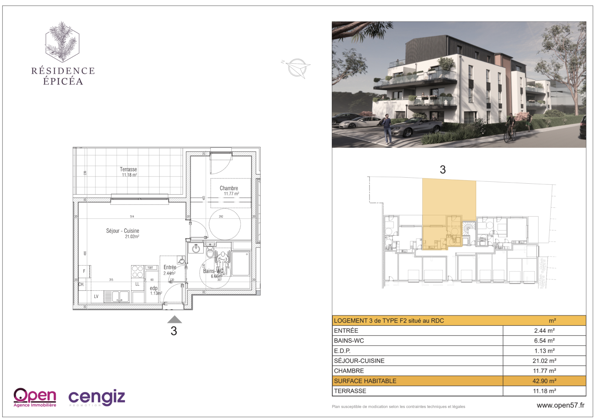 Découvrez le Lot 3 de la Résidence ÉPICEA à Aumetz, un appartement de type F2, d’une superficie de 42,9 m2 situé au rez-de-chaussée, avec un extérieur de 11 m2, proposé au prix de 150 000 €. Pour un stationnement adapté à vos besoins, vous avez le choix entre un emplacement extérieur à 5 000 € et/ou un garage individuel avec porte motorisée au prix de 15 000 €. Ce garage est équipé d’une prise électrique et d’un éclairage, et peut être aménagé avec une borne de recharge si nécessaire. Cet appartement bénéficie d’une localisation idéale, à quelques minutes des axes autoroutiers et de la frontière luxembourgeoise, vous offrant ainsi un cadre de vie pratique et accessible pour vos déplacements quotidiens. La Résidence ÉPICEA propose 17 appartements modernes, du F2 au F4, à partir de 160 000 €. Chaque logement dispose d’un espace extérieur privé, idéal pour se détendre (terrasse ou balcon). Pour en savoir plus, contactez-nous au 03 82 54 73 57 ou par e-mail à contact@open57.fr. OPEN IMMOBILIER 20, Allée du Château de Gassion, 57100 Thionville