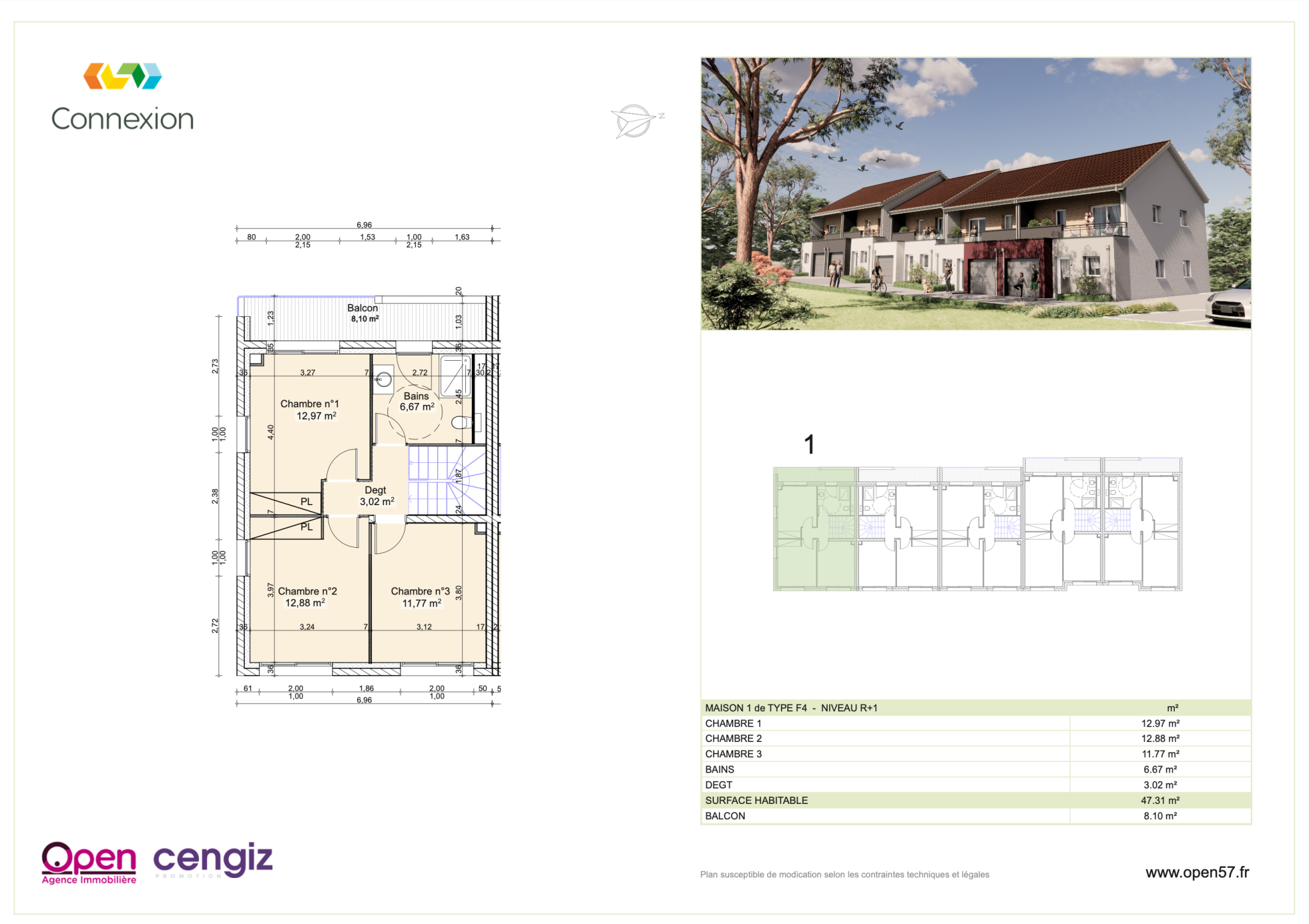 Découvrez le Lot 1 du projet résidentiel Connexion à Hettange-Grande : une maison mitoyenne d’un côté, construite de manière individuelle, proposée au prix de 400 000 €. Elle dispose d’une surface habitable de 93,73 m2, complétée par un garage de 14,34 m2, une terrasse de 13,55 m2 avec espace vert au rez-de-chaussée, ainsi qu’un balcon de 8 m2 à l’étage, offrant des extérieurs agréables et bien aménagés pour votre confort. Ce projet comprend cinq maisons modernes de type F4, pensées pour offrir un cadre de vie calme à proximité de la frontière luxembourgeoise. La commune d’Hettange-Grande propose un environnement idéal pour les familles, avec des écoles, commerces, services de proximité, et un accès rapide aux transports en commun. Chaque maison est équipée de prestations haut de gamme et entièrement personnalisable : chauffage au sol, menuiseries en PVC double vitrage, volets roulants électriques, isolation extérieure performante, entre autres. Pour plus d’informations, contactez-nous au 03 82 54 73 57 ou par e-mail à contact@open57.fr.