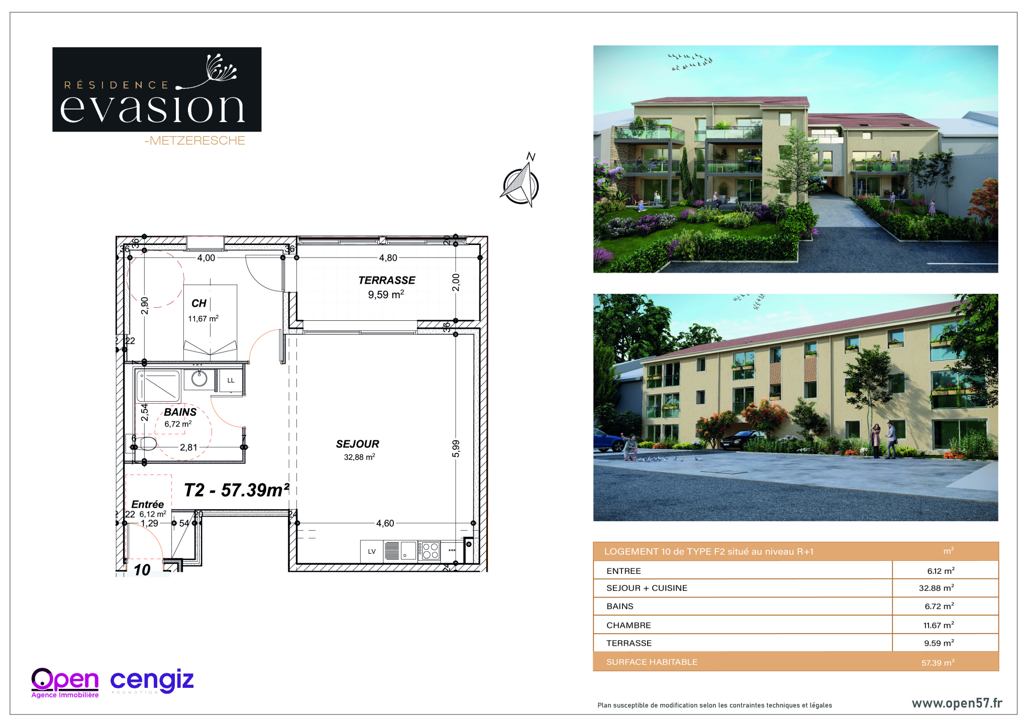 Nous sommes ravis de vous présenter la résidence de haut standing « Evasion». Située à quelques minutes de la frontière et à proximité des principaux axes autoroutiers. Idéalement positionnée pour les personnes actives. Cet appartement de deux pièces situé au r+1, offrant une superficie habitable de 57,39 m2, vous séduira de par son espace de vie spacieux et lumineux. De plus, profitez d’un espace extérieur privé de 9,59 m2 où vous pourrez vous ressourcer dans un environnement paisible. Les prestations offertes dans cet appartement sont à la hauteur de vos attentes les plus élevées. Les finitions haut de gamme, telles que le carrelage au design raffiné et l’utilisation de matériaux de qualité, ajoutent une touche d’élégance à votre espace de vie. De plus, vous avez la possibilité de personnaliser certains éléments afin de créer un espace qui vous ressemble et qui répond à vos besoins. La livraison de cet appartement est prévue pour le troisième trimestre 2026, vous laissant ainsi le temps nécessaire afin de planifier sereinement votre installation. Cet appartement est une véritable opportunité pour ceux qui recherchent l’excellence et la commodité. Ne manquez pas cette occasion unique de vivre dans un cadre idyllique, alliant confort, sécurité et rentabilité. Contactez nous dès aujourd’hui pour obtenir plus d’informations sur cet appartement d’exception au sein de la résidence « Evasion ». OPEN IMMOBILIER 20, ALLEE CHATEAU DE GASSION 57100 THIONVILLE- 03.82.54.73.57